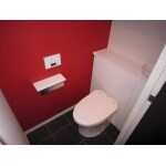 既存も収納型のトイレでしたが、今回も収納型のトイレ、TOTOレストパルI型にお取替えしました。 床材は既存利用ですが、壁にはアクセントで真っ赤なクロスを施工。 今までと全く違った印象になりました。