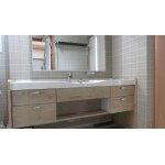 洗面台はホワイトとオーク柄で、クロスは温かみがあり、かつ汚れの目立たないチェック柄にて清潔感のある洗面空間を演出させて頂きました。