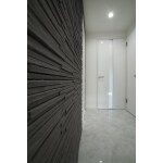 部屋全体のインテリアと同じく、白と黒で統一した廊下空間。 玄関入って正面のアクセントパネルにはINAXの千陶彩タイルを採用。 外壁でも使える立体感のあるオシャレで高級感のあるタイルです。