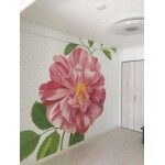 クロスの長さが天井高より長かったため、上下の葉っぱの部分を切り落とせざる終えなくなったため、バランスを特に打合せ、梁に巻き込めるよう提案をしました。 逆に、クロスの幅は壁よりも短かったため、花を部屋の中心に張り、空いた両端の壁は白色のクロスで花を引立てる提案をしました。