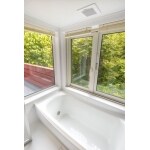 ご主人こだわりの浴室は、森を間近に感じる特等席。 両開きの大型窓は、このユニットバスの最大開口寸法で特注しました。
