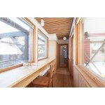離れと母屋をつなぐ渡り廊下には、カウンターを造作して奥様の書斎コーナーを設けました。 アンティークの照明は新築当時から廊下を優しく照らしてくれます。
