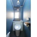 窓を遮らないタンクレス風トイレを採用。 ブルーの壁紙はモダンなトイレを演出します。