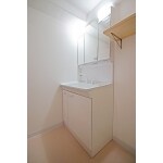洗面化粧台は三面鏡の中も収納になっていて便利。洗濯機置き場の上に便利な棚も設置しました。