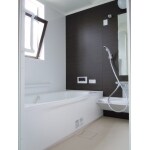 既存の浴室は、1221というかなり勝手の悪いサイズのユニットバスで、浴槽が狭く・洗い場が無意味に広いという状態でした。 そこで、浴槽は広く・洗い場は勝手の良いサイズにということで、1616の一坪サイズに変更。さらに、長手方向を縮める事により出来るスペースを、廊下側からの収納と脱衣場の収納スペースに利用し、収納力をアップ。洗面化粧台は、スリムな奥行のTOTOリモデアを採用し、可能な限り脱衣場のスペースを確保。建具は全て引戸を採用し、限られたスペースでの動線を考慮。≒2.5坪の床面積に全ての要素を凝縮しました
