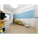 壁一面にお部屋の雰囲気やお好みに合わせてエコカラットをデザイン貼り。子供部屋は明るく楽しいムードに。 カーテンもエコカラットの色に合わせて、ちょっと遊んでみました。