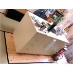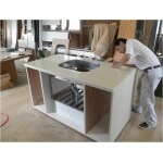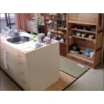和室につながる部屋(準備室)にもお茶菓子を並べられるよう、アイランド式の台を設置し、囲んで作業ができるようになっています。 台は、お客様の使い勝手に合わせて木工所で製作しました。