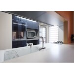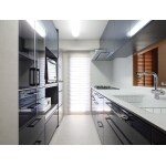 当初、LD全体の内装までは改修の予定に入っていませんでした。しかし、対面の間仕切り壁のカウンターは交換をご希望でしたので、壁面のクロス張替えは必要です。 似たようなクロスで仕上げても、どうしても違和感がでます。 そこで、この間仕切り壁を落ち着いたオレンジ系のクロスで仕上げることをご提案しました。ザ・クラッソの鏡面仕上げの濃紺ともよいコントラストになっています。