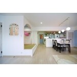 和室をなくして収納スペースを設けることで広々としたLDKが実現しました。 リビングが開放的で会話がしやすく、来客時でも広々とお使いいただけるリビングになっています。 本棚収納の前に造作したうんていは娘様が遊ばれるだけでなく、ハンモックを吊ってお母様がくつろげるご家族の共有スペースになりました。 内装も白を基調にして二種類のクロスを合わせています。 パステルカラーやレンガ調のクロスでかわいくナチュラルな空間へと変わりました。