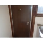木製の玄関扉は防犯上もあまりお勧めできないので、アルミ製のフラッシュドアに変更しました。また、ドアスコープを設置して鍵も変更しています。扉の見た目は他の部屋と変わらないように木目調で仕上げています。 工期は、扉の制作期間も含めています。