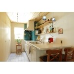 カウンター使いも出来る広めの作業スペースを備えた、壁付けのおしゃれなキッチンを目指しました。IHコンロ側の壁には掃除がしやすく、デザイン性の高いブルーの長方形タイルを貼り、流し台の上に設置した木製の棚は、カフェ風スタイルを意識した「見せる収納」でインテリア効果もプラスしています。