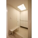 玄関はおもてなしの演出として、天井を折り上げ天井に造作し、人感センサー連動の間接照明を取付けました。光源の見えない間接照明により、空間がやさしく照らされます。 座って靴の脱ぎ履きが出来るように集成材のベンチを取り付けました。ちょっとした荷物の置き場としても便利な工夫です。 タタキ部分は大理石調のタイルを張り、框も同材で仕上げています。 玄関から見える廊下の壁面はミラーとエコカラットで仕上げました。エコカラットは縦張りでシャープな印象にしています。