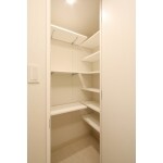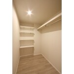 玄関にはシューズインクロークを設けました。内部は4点支持の可動棚柱と2点支持の持ちおくり可動棚柱を使い分け、空間を最大限活用できるように工夫しています。 大型ウォークインクロークにはワイドスパンのハンガーパイプと枕棚を取付け、洋服をたくさん掛けられるようにしました。正面の壁面には解体後に判明したスペースを活かし、2点支持持ちおくり可動棚柱を取付けました。 壁と見た目が一体化しやすいようにホワイトの棚柱類を選定しています。