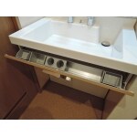 混み合っていた洗面所・トイレ・お風呂を間取り変更し、収納スペース付きの洗面所を作りました。当初の打合せでは一般的な洗面化粧台に交換を希望されていました。ショールームへ行き、商品の確認をしている時にミズリアのニースペースタイプを見て「車いすにも対応できそう」と気に入られました。収納スペースに可動棚を設け、タオル・洗剤ストック・掃除道具入れと使い勝手に合わせられるようにしました。