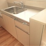 ミニキッチン正面の壁とガスレンジ横の壁にキッチンパネルを採用しました。 一段と明るくなり、お掃除も楽にできます。