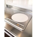 斜めカットの中間棚は、座ったままで手が届く収納棚で、出し入れしやすいようになっています。コンロはお掃除がしやすく、危険が少ないIHコンロを施工させて頂きました。