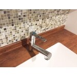 洗面所にはヨーロッパで使用されているカウンターとボールを設置して周りにはガラスモザイクタイルを貼り、床にコルク材を使用しました。