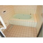 空間に彩りをあたえるクリアな色調の人造大理石を使用した浴槽の「INAXグラスティN」を採用。 浴槽に水がたまるとキレイです。 床タイルは、抗菌機能付きの滑りにくいものへ貼り替え、安全な浴室になりました。