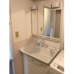 3面鏡の為広く見え、収納もたっぷりできる弊社特価のTOTO KEシリーズ 750幅タイプ 3面鏡エコミラー2枚扉タイプ化粧台へ交換をご提案させて頂きました。またクロスの汚れを防ぐ為、キッチンパネルの貼り付けを行いました。