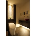トイレは珪藻土の壁の塗り方を工夫して印象的に演出。間接照明を使ってより上質な空間になるようにしました。便器には掃除のしやすいタンクレストイレを使用。手洗いボールには清水焼きを使用し、京都らしい雰囲気を持つプラス。モダンな和風のイメージを持つ、洗練された美しいトイレに仕上がりました。