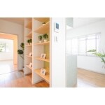 収納を増やしたいとのご要望でしたので、キッチン移設に伴い玄関から通る廊下の部分ですがここにオープンの棚を設置しました。小物や本などを収納する場所が欲しいとの事でしたので充分な収納力を確保しています。隠したいものがある場合は天井にロールスクリーンが設置できるようになっていて住んだあとで隠すことも出来ます。