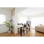 仕切りの引違の扉を取り払いキッチンと繋がりがもてるお部屋になりました。コンクリートの壁は壊せないのでメープルの化粧板を張りアクセントの壁にしてみました。