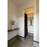 ゆったりとした間取りの玄関は、間仕切りを設けシューズクロークを分けました。見た目はスッキリで、大容量で大型の物も収納出来ます。