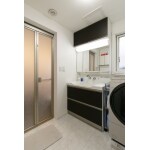 トイレや浴室とイメージを合せてダークブラウンの洗面化粧台は間口も大きくしてトール収納も取付ました。