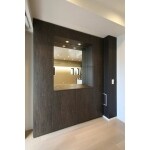 カーテンボックスと梁型を活かし、壁を照らすコーニス照明を造作しました。アクセントクロスはラメの入った煌きのあるデザインで仕上げました。 内装に一体感を生み出すため、木目柄の壁紙と造作家具の面材は建具の色柄をベースに選定しました。 ダイニングにはお皿やグラスを収納できる造作家具を取付けました。両サイドと腰下はプッシュラッチを用いることですっきりとしたデザインの開き扉収納としています。中央は奥行感を出すために背面をミラー仕上げにし、軽やかな印象になるようガラスの飾り棚を取り付けています。上からはピンスポットライトを取付け、飾るものを浮きだたせるような演出をしています。 リビングのデッドスペースとなるパイプスペース脇の窪みを活かし、ダーク色のオープン棚を取付けました。金物を使わずに取り付けることですっきりとした印象に仕上げています。 ペットゲージを置く場所には消臭効果のあるエコカラットをお張りしました。全体的な内装の統一感を考慮してグレーのラフクオーツをご選定いただきました。