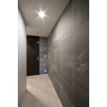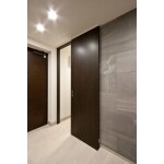 廊下の壁面は片側を石目柄が美しく豪華な印象のエコカラットストーングレースを大胆にお張りしました。馬張りにすることでより表情を出しています。逆側の壁はラメが美しく輝くグレーのアクセントクロスで仕上げています。リビングから見える手前の壁面はリビングの木目柄の壁紙と合わせて張り、一体感を生み出しています。シューズインクロークの扉はもともと開き扉でしたが、より使いやすいように引戸に交換しました。天井埋め込みのアウトセット引戸にすることで見た目をすっきりとさせています。