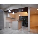 キッチン上部の梁については、解体した母屋にあった梁が意匠的に良さそうであったことから、移設して利用することをおすすめしました。 構造面の検討によりキッチン前の造作収納部分へデザイン的に柱を組み込むプランとし、造作収納についてはイメージ図等でカラー、大きさ、形状をご相談しながら計画を進めました。 キッチン前のカウンターは銘木店で見つけた無垢ミミ付ウォールナット材になっています。