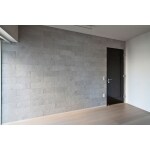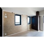 豪華な寝室を演出するゴールドの壁紙はくどさが出ないように配慮し、柱型にはウォルナット柄で落ち着いた木目柄の壁紙を張り分けてアクセントにしています。エコカラットは壁面全体にアンティークマーブルのグレーを馬張りで張ることでクラシカルな表情を生み出しています。