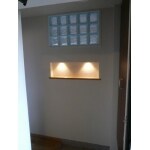 間仕切壁に開口を設け、ガラスブロックをはめ込んで採光を確保して、ガラスブロック下部にニッチを設けて壁面のアクセントとしました。