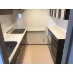 収納量を確保するために、引き出し式のキャビネットをお薦めしました。明るくしたいとのことだったので、ステンレストップよりも、人造大理石トップで背面収納のほうも揃えて全体的に統一感を出し、明るい印象にしました。