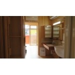 浴室から出ると、右側に洗面カウンター、洗濯流し、洗濯機が並びます。左手には収納を取りました。正面はサンルームです。