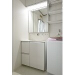 ドラム式洗濯機の大きさに合わせ、現在の洗面化粧台と同じ幅の洗面化粧台をご希望。 洗面室を清潔感が感じられるような提案をして欲しい。