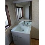 今度は、歯ブラシ等を隠せるように3面鏡としました。設置場所の上部は、屋根の勾配通りに、斜めになっている為、壁際から少し離して設置しております。