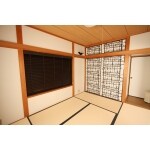 お施主様こだわりの畳はダイケン清流の【乳白色】ヘリは【墨染色】 襖はモノトーンの総柄クロス。 ブラインドも黒を採用。既存の扇形照明も雰囲気があうため、継続使用をご提案。