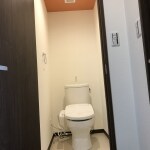 清潔感あふれるウォシュレット付きのトイレにしました。 扉の色合いにあわせ天井にシックなオレンジのアクセントクロスを貼る事によりお洒落な空間をご提案致しました。