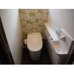 ご要望の節水型トイレに、背面にタンクのないタンクレスタイプをご提案いたしました。 手洗いを別に設ける必要がありますが、背面がスッキリとして広く感じられます。 また、背面のクロスはアクセントとして緑の花柄を入れました。
