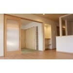 打ち合わせ時から照明など細部の使用まで確認を行った、こだわりのリビング。お子様が増えた場合を考慮し、建具には割れないポリカーボネートを使用。