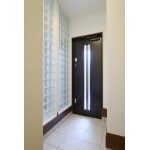 元の広い玄関を、親世帯、子世帯2つの玄関にしました。ドアの色も親子別々で個性を出しています。 明るい玄関ホールをご希望された子世帯にはガラス壁で外の光を取り入れました。
