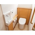 今までなかった手すりと背面の収納を設置。洗面所の拡張分、幅が狭くなりましたが、段差解消や手すりにより使いやすいトイレへ。また開き戸だった扉をできるだけ動きを最小限にするため折戸ドアを設置しています。