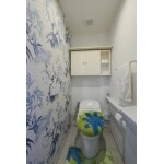 TOTOの製品を採用し、収納庫は既存のものを使用。ホワイトの壁紙を基調に、入って左手の壁面には、植物や鳥の柄を絵画風に配したエレガントでインパクトのあるブルー系の壁紙を配した。