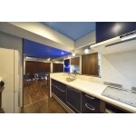 インテリアに造形の深い施主様ご夫婦で選びぬいた内装はこだわりの青。全ての部屋に青を使っていますが使用している木目に合わせて青を変えています。木部も様々な種類を使うことを検討されましたが、うるさくなりすぎることを避けてフローリングのウォールナットをベースにケンカしないように壁の羽目板、ウッドブラインドを選ばれました。 平面プランニングではご夫婦それぞれの寝室と広いLDKを計画。ソファ位置に合わせてTVを壁付けするために新たに壁を設け、その裏を収納、洗濯物を干すスペースとしました。リビングからは見えず、アクセスも良いので使い勝手もよくなりました。そしてご夫婦共通の趣味のアクアリウムがリビングの主役に。専用スペースを設けライトが映えるつや消しの黒のキッチンパネル、防水コンセントを使い水じまいを良くしています。