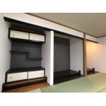 3.3㎡畳スペースを広くとることに成功。メンテナンスを考慮し天井/壁はラミネート天井/聚楽壁からクロス壁に変更。 畳の縁はあえてい草の色に近い物を採用し、存在感をなくした。