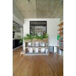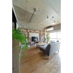 お施主様のご趣味の良いインテリアや緑がとてもよく映えるインダストリアルな空間を提案。 躯体剥き出しの天井に無垢フローリング。足場板の古材やアイアンの金具で作った造作家具などこだわりが詰まったお家です。