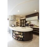 I様が一目惚れしたというラウンドタイプのキッチンの形状に合わせて天井にアールをつけ、リビングの入り口やパントリーの垂れ壁にもアールを取り入れ、キッチンが活きるデザインを提案しました。最初に施工した水まわりと今回リフォームしたキッチンや収納扉の色味も違和感がないように統一。
