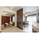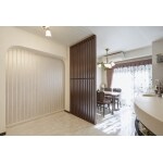 単なる設備交換だけでなく、女性目線で住みやすさや将来の家族構成の変化まで考えたプラン、趣味やライフスタイルまで汲み取った提案を心掛けました。 「打ち合わせ時は単身赴任中でしたが、将来戻ることも考えて、十分な収納を考えてくれました」と喜んでいただきました。 また、玄関からダイニングが見えないように格子も設置。リビングとの仕切りには縦型ブラインドを提案しました。