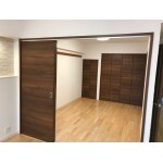 リノベーション工事済みで綺麗な和室でしたが、使い勝手が悪いとの事で洋室に変更します。 既存周辺の仕上げ材と同じ物を手配して違和感ない仕上がりにします! 和室ーリビング間の扉は、2枚片引き戸で高さもあまりありませんでした。